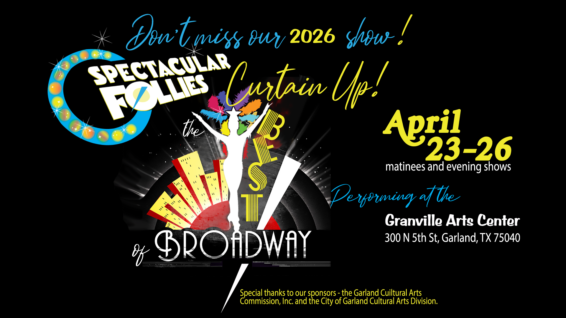 Auditions for the Spectacular Follies’ “Curtain Up! The Best of Broadway” will be held on Jan 11 and Jan 31, 2026.