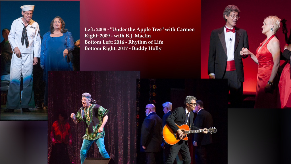Steve was singing in a vocal quartet with Andy Michlin, the original Follies music director, when Andy’s wife Judy urged him to audition. “I had no idea what I was getting into,” Steve recalls. “Nobody did, really.” His first audition with founder Mark Carroll was both fun and nerve-wracking, and the first show — more than three hours long — was “scary and exhilarating.” Steve sang five lead numbers that year, only one of which he’d performed before.